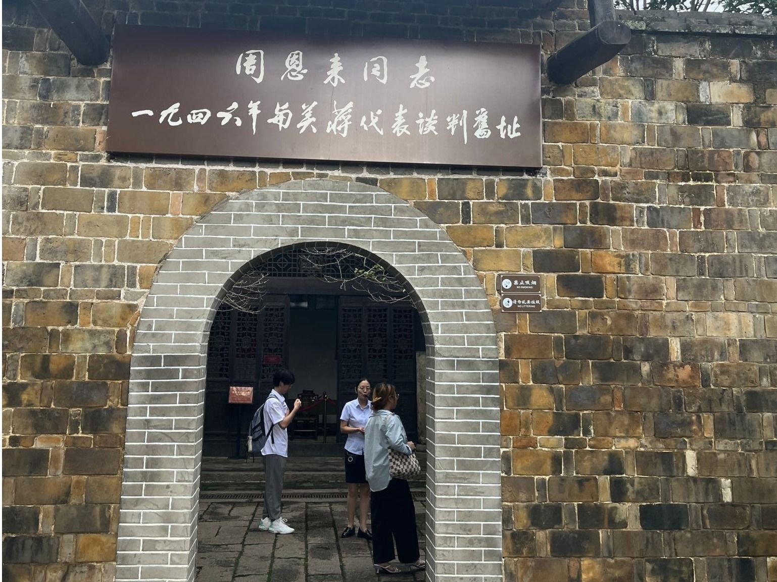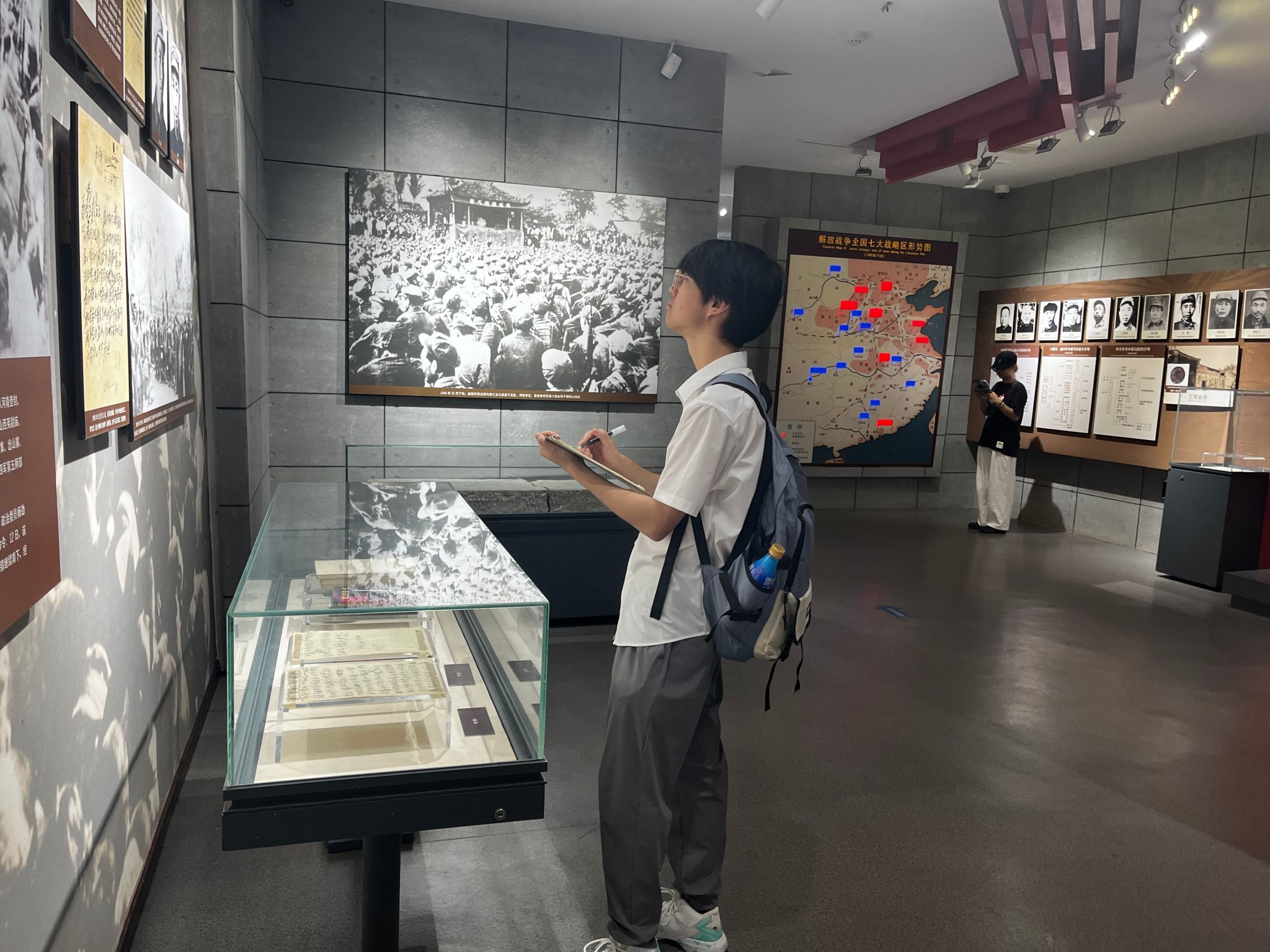 7月,實踐團隊師生從武漢市區(qū)出發(fā)抵達孝感,輾轉(zhuǎn)兩個多小時,抵達紀(jì)念館。在帶隊教師王雪的指導(dǎo)下,團隊成員觀摩學(xué)習(xí)紀(jì)念館內(nèi)的每一件文物、每一張照片,在行走中觸摸歷史脈動?!斑@可比坐在教室里生動、有趣得多,我們?nèi)绻苡脭?shù)字手段再現(xiàn)這一切,就能讓更多同學(xué)在線上沉浸式體驗這段歷史,太棒了!”隊員王若汐與同行的同學(xué)們分享著激動之情。在聽完講解后,同學(xué)們用隨身攜帶的紙筆和單反相機對整個館區(qū)作了初步的素材采集。